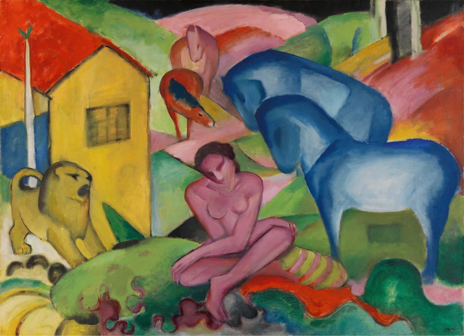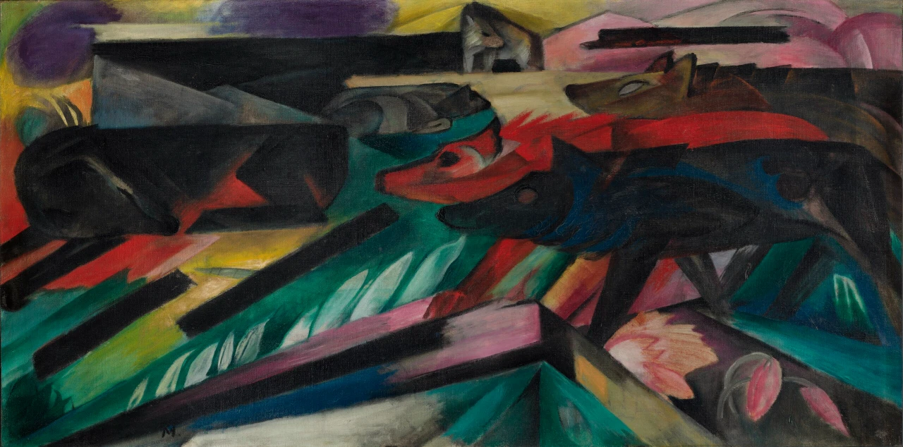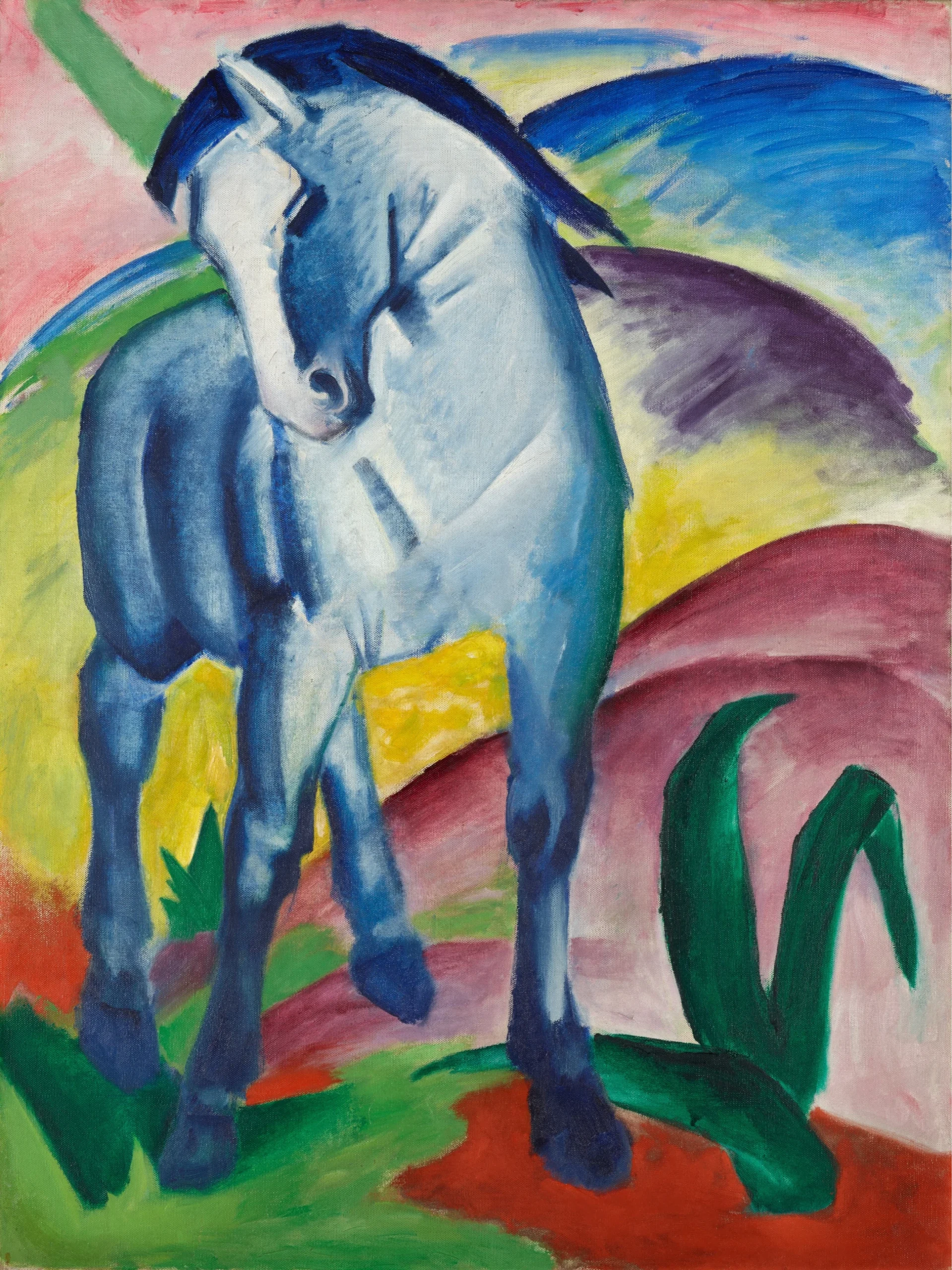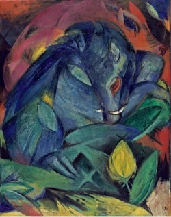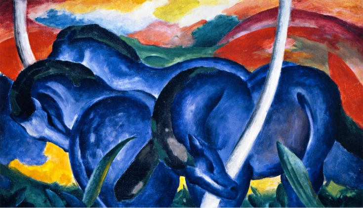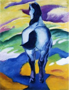 Franz Marc was a German Expressionist painter and founding member of Der Blaue Reiter group. Renowned for his vibrant depictions of animals, Marc used bold colors and simplified forms to convey emotional and spiritual qualities. His paintings, such as Blue Horse and The Large Blue Horses, emphasize harmony between nature and humanity. Marc’s work was deeply symbolic and often inspired by his interest in spirituality and mysticism. He died young during World War I, but his innovative style significantly influenced modern art and the development of Expressionism.